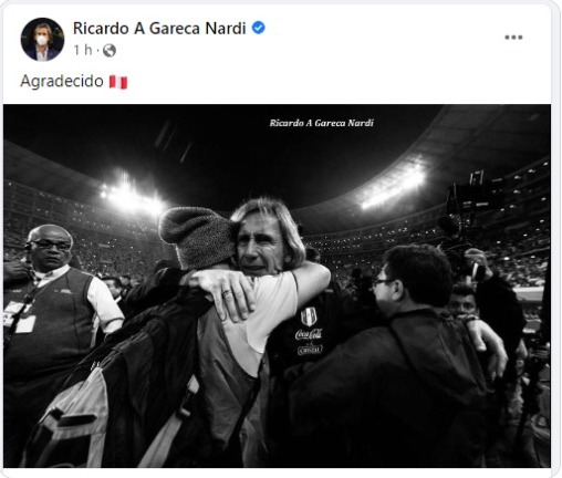 “Agradecido (junto a una bandera de Perú)”, escribió Ricardo Gareca en su publicación de Facebook donde se le ve recibir un abrazo de gratitud.