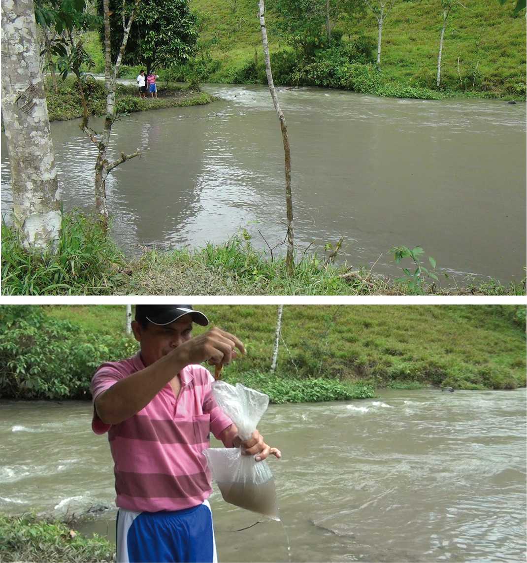 Un morador de la zona tomó muestras de las aguas del río y mostró el verdadero color de la parte alta que es cristalino, sin embargo desde el sector el Ojo se volvió turbio desde la madrugada de ayer, es por este motivo que personal del sector Salud también llegó al lugar para sacar muestras del recurso hídrico.