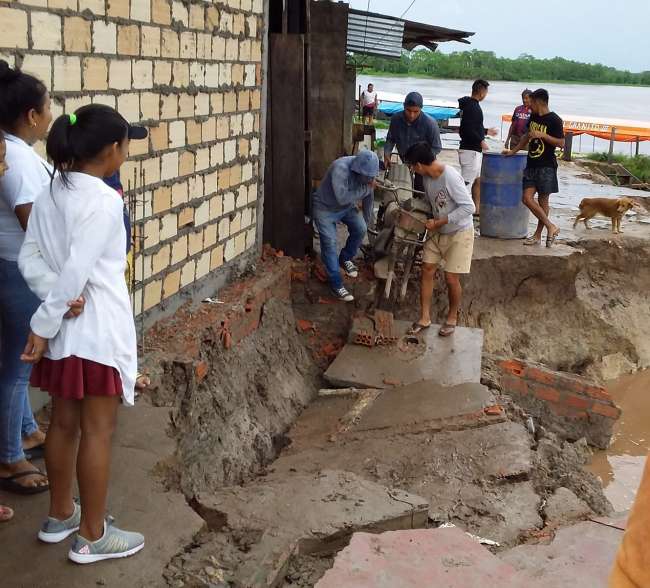 En Villa Lagunas, capital del distrito del mismo nombre en la provincia de Alto Amazonas, el desborde del Río Huallaga ha causado rompimiento de veredas y pisos de casas y hospedades ubicados cerca del embarcadero Santa Gema.