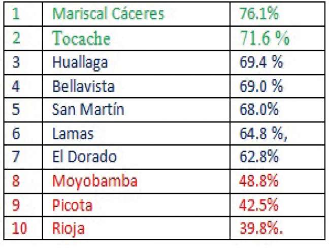 Al 5 de diciembre, la ejecución a nivel de las diez provincias se encuentra establecida de la siguiente manera: Mariscal Cáceres 76.1%, Tocache 71.6 %, Huallaga 69.4 %, Bellavista 69.0 %, San Martín 68.0%, Lamas 64.8 %, El Dorado 62.8%, Moyobamba 48.8%, Picota 42.5% y Rioja con apenas el 39.8%. (Franclin Laván)