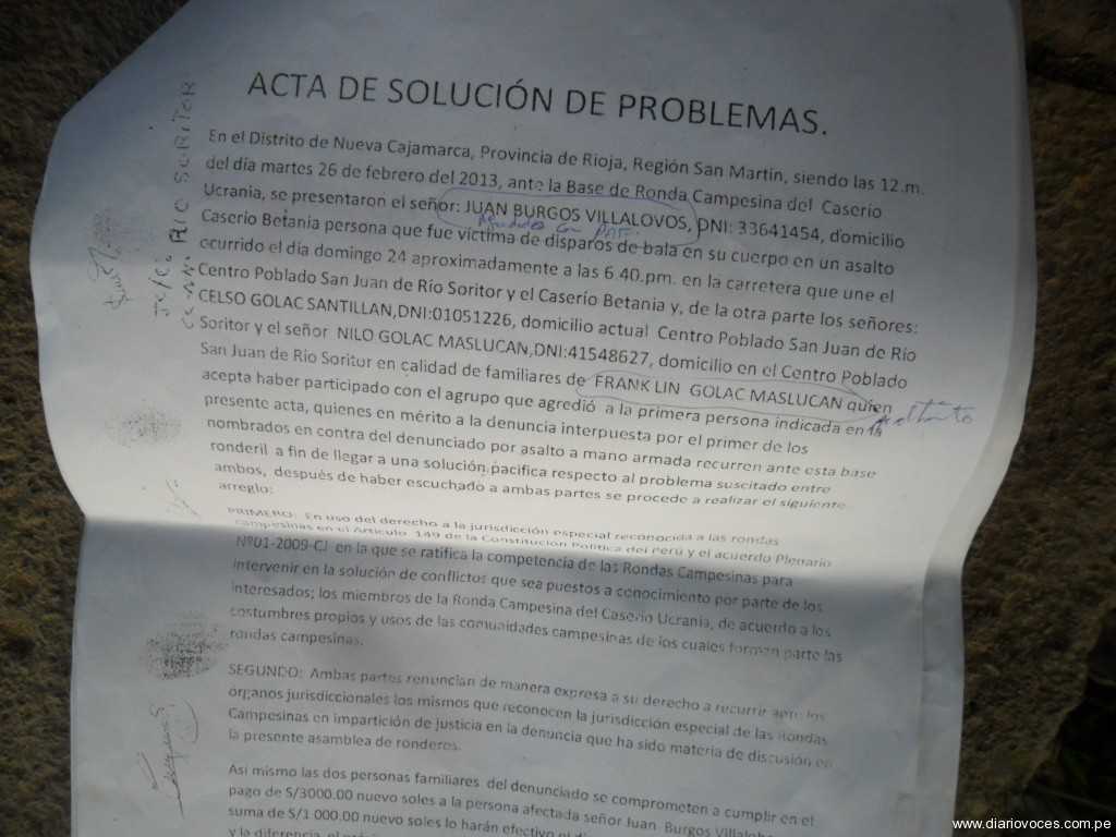 Según un documento denominado “acta de solución de problemas” de fecha 26 de febrero 2013, la ronda campesina de Ucrania, hace conciliar a Juan Burgos Villalobos quien fue víctima de asalto y robo a mano armada seguido de agresión por PAF, con Celso Galoc Santillán y Nilo Galoc Maslucan, padre y hermano del convicto y confeso Franklin Golac Musculan, quienes se comprometen a cumplir con el pago de tres mil soles a favor del agraviado, con un adelanto de mil nuevos soles, esto supuestamente a cambio de la liberación del presunto agresor que por sus propias declaraciones era integrante de la banda de asaltantes, responsable de varios hechos delictivos.