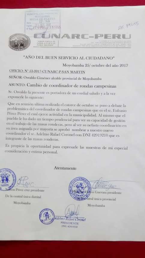 El documento fue presentado en mesa de partes ayer miércoles 25 de octubre y esperan se tenga rápida respuesta por parte de la autoridad edil. De acuerdo a la versión de los dirigentes ronderiles Pérez Pérez desde que fue designado en el cargo de coordinador de las rondas, no ha efectuado un trabajo que haya permitido la canalización u aprobación de algún proyecto en favor de la organización campesina.