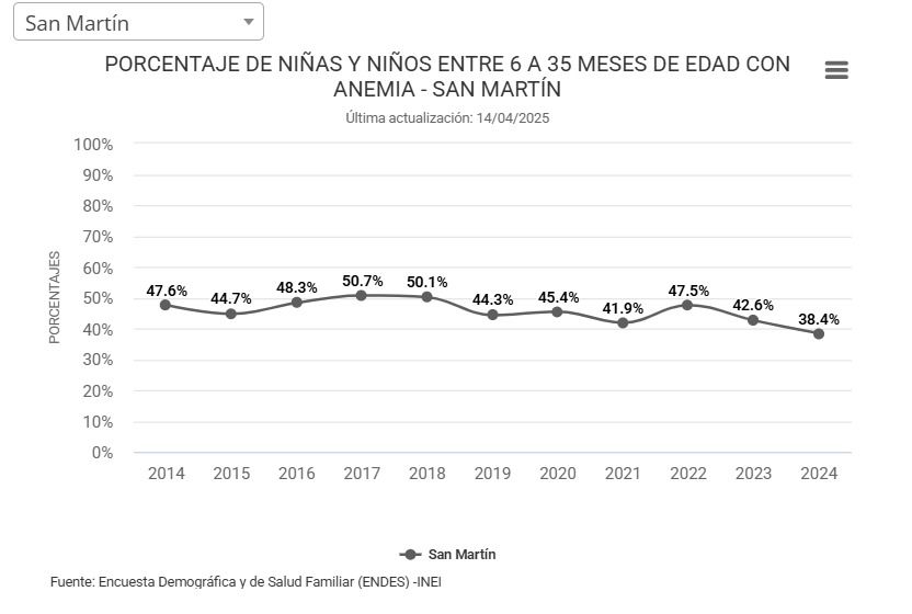 La anemia infantil también sigue siendo un problema importante. La ENDES 2024 indica que el 38% de los niños entre 6 y 35 meses tienen anemia, lo que repercute en su desarrollo cerebral y en su aprendizaje. Este panorama muestra la necesidad urgente de reforzar la suplementación con hierro, los controles de crecimiento y desarrollo, y acompañar a las familias para mejorar la alimentación desde los primeros meses de vida.