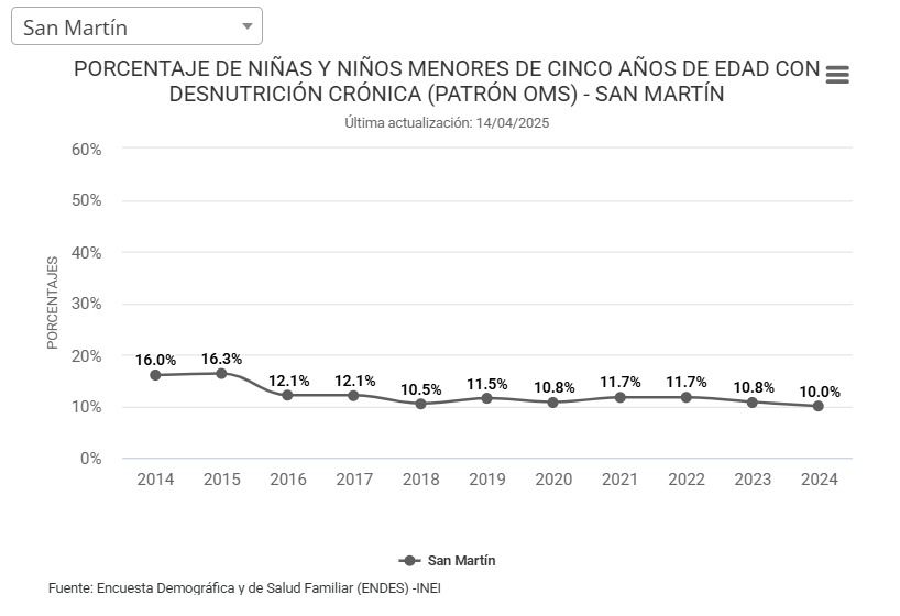 Según la Encuesta Demográfica y de Salud Familiar (ENDES) 2024, el 10% de los niños y niñas menores de cinco años en San Martín sufrió desnutrición crónica. Esta situación representa un riesgo que, de no atenderse a tiempo, podría afectar el desarrollo integral de la primera infancia.