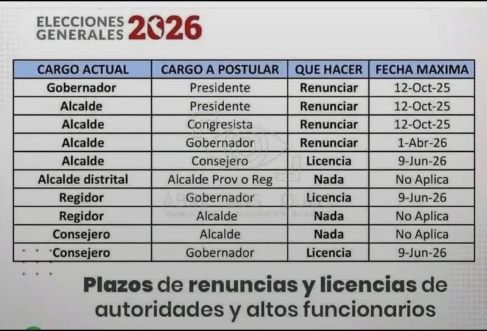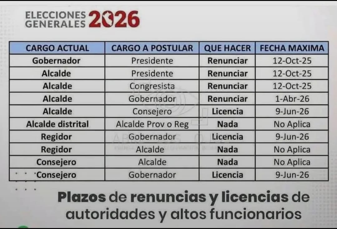 Asimismo, los alcaldes que deseen postular como consejeros regionales deberán solicitar licencia hasta el 9 de junio de 2026. En tanto, un alcalde distrital que postule a la alcaldía provincial no necesita renunciar.