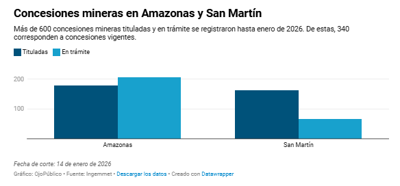 Un análisis de información oficial del Instituto Geológico, Minero y Metalúrgico (Ingemmet), realizado por OjoPúblico, revela que más del 50% de las concesiones mineras vigentes y en trámite en San Martín y Amazonas se superponen con áreas naturales protegidas, zonas de amortiguamiento, ecosistemas frágiles y otros territorios restringidos por ley. De un total de 612 concesiones, 310 se ubican total o parcialmente en estos espacios, lo que representa una seria amenaza para los bosques, las fuentes de agua y las comunidades que dependen directamente de ellos.