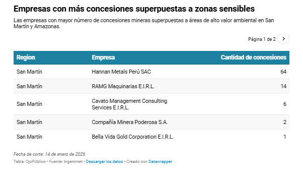 La dimensión política del problema se profundiza al observar la concentración de derechos mineros. En San Martín, solo una empresa, Hannan Metals Perú S.A.C., controla el 50,8% de la superficie concesionada para minerales metálicos. Le siguen Sociedad Minera Vicus Exploraciones S.A.C. y la Compañía Minera Poderosa S.A.. Este escenario plantea serias preguntas sobre quiénes deciden el destino del territorio amazónico y bajo qué criterios se prioriza la entrega de concesiones.
