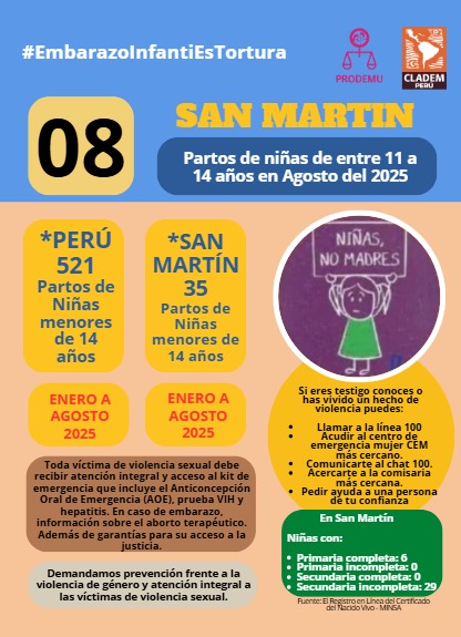 La región San Martín es una de las más afectadas, con 35 partos registrados en niñas de entre 11 y 14 años en lo que va del año. Solo en agosto, se reportaron 8 partos infantiles, lo que representa un incremento preocupante frente a los meses anteriores.