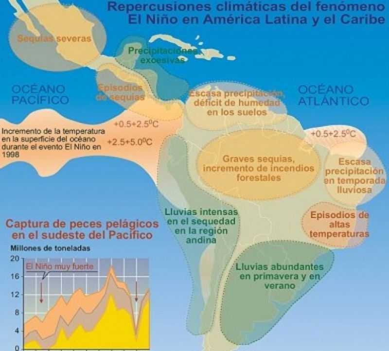 La dirección del viento, las corrientes marítimas y los patrones de tormentas también se ven afectados por ello. En el ámbito regional, las repercusiones pueden ser importantes. En América Central, El Niño trae lluvias excesivas a lo largo de las costas del Caribe, mientras que las costas del Pacífico se mantendrán secas. Las lluvias aumentan en las costas del Ecuador, al norte del Perú y las zonas del sur de Chile. En Ecuador, Perú y Bolivia, habrá sequías en las zonas montañosas y de los Andes, lo que significa un retiro de los glaciares, con los cambios ulteriores en la disponibilidad de agua y en la biodiversidad local. En Colombia, Venezuela y Guayana, las precipitaciones tendrán tendencia a disminuir, provocando sequías en el noreste brasilero. En Argentina, Paraguay y Uruguay, las lluvias aumentarán y habrá una subida en las temperaturas en la zona sur del Brasil.
