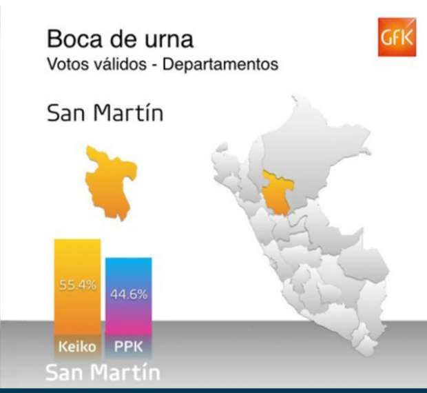 San Martín fue una de las regiones que Fuerza Popular obtuvo el triunfo en las urnas, según la encuestadora GFK quién difundió el sigueinte resultado: