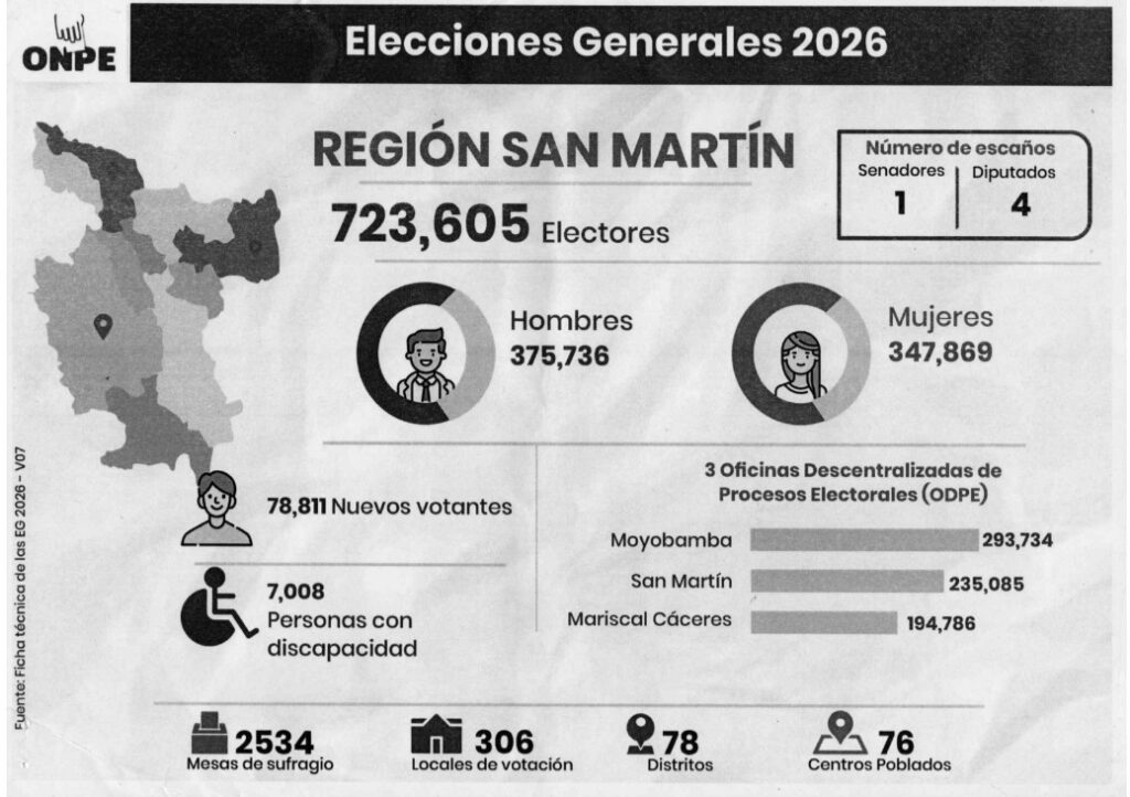 La Oficina Nacional de Procesos Electorales (ONPE) presentó la ficha técnica de las Elecciones Generales 2026, revelando que la región San Martín cuenta con un total de 723,605 electores habilitados, consolidándose como un escenario clave dentro del mapa electoral peruano. Este universo de votantes refleja una distribución relativamente equilibrada por género: 375,736 hombres y 347,869 mujeres, lo que evidencia una participación amplia y diversa en el proceso democrático.