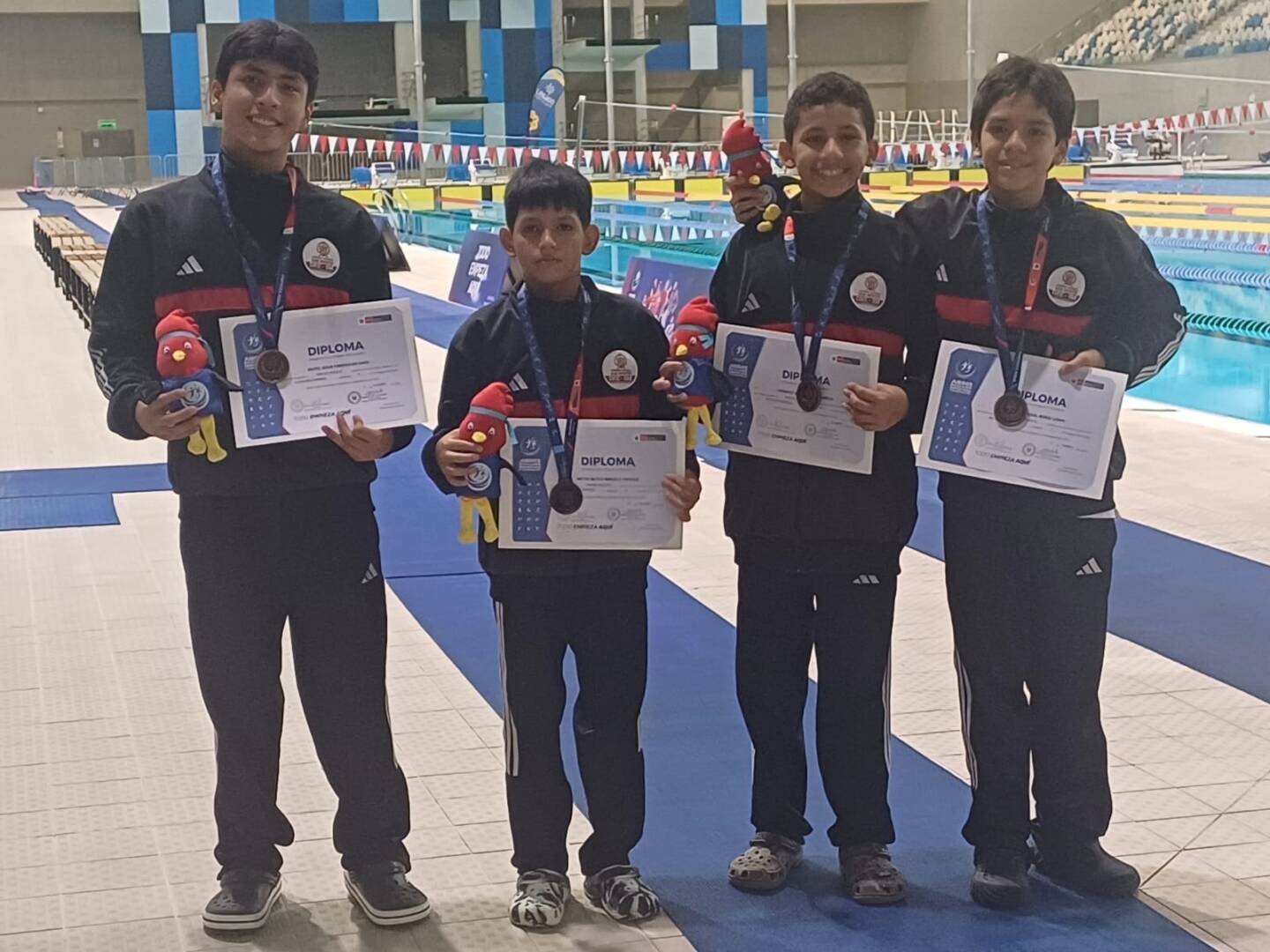 Nuestros estudiantes de la UGEL San Martín, Leonardo Martín Bartra García (I.E. Virgen Dolorosa), Gonzalo Miguel Muñoz Lizana (I.E. Innova Schools), Mateo Jesús Paredes Delgado (I.E. Ciencias) y Nietch Matius Marcelo Vásquez (I.E. Juan Jiménez Pimentel), participaron en la disciplina de natación (categoría A), de la prueba de relevos combinado 4x50m, obteniendo el tercer puesto a nivel nacional.