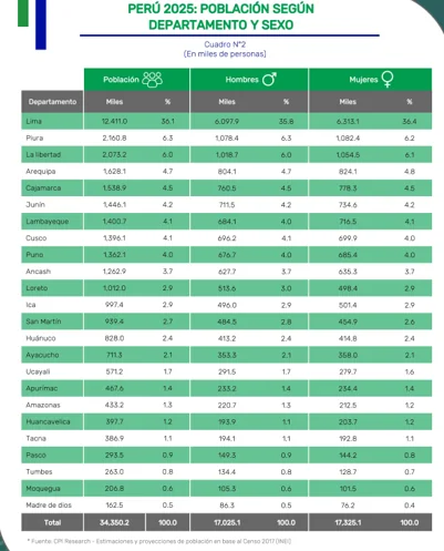 El Perú alcanzará en 2025 una población estimada de 34 millones 350 mil personas, de las cuales 17.3 millones son hombres (50.4%) y 17.02 millones mujeres (49.6%), según las proyecciones oficiales basadas en el Censo 2017, a la espera de las cifras que vayan a dar el censo en proceso.