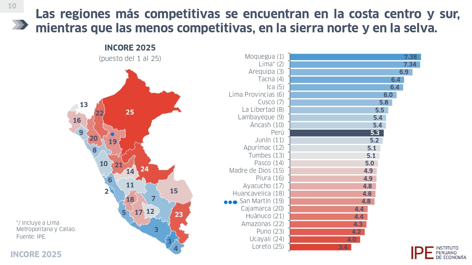 San Martín, en particular, está en riesgo de ingresar al grupo de regiones menos competitivas si no se toman acciones concretas y urgentes. La caída en su posición en los últimos años evidencia la necesidad de retomar y actualizar el Plan de Desarrollo Económico elaborado en 2015, que contempla proyectos estratégicos fundamentales para su crecimiento.