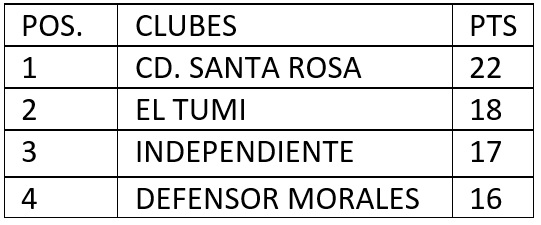 Con el triunfo categórico en el inicio de la Liguilla del balompié moralino, la escuadra Santa Rosa ha sumado 22 puntos al vencer a Defensor Morales por la cuenta de 5-3, mientras que los elencos de El Tumi y CD. Independiente terminaron sin abrir el marcador.
