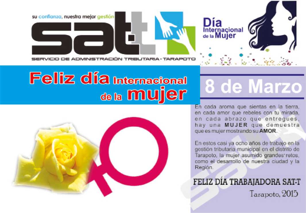 La institución, cumpliendo con su compromiso de promover un trabajo articulado, hace un reconocimiento a las mujeres del mundo y especialmente a las trabajadoras del SAT en el “DÍA INTERNACIONAL DE LA MUJER”, que se conmemora cada 8 de marzo en todo el mundo, este reconocimiento fue firmado por 189 gobiernos hace 20 años y que estableció la agenda para la materialización de los derechos de las mujeres. Si bien los logros han sido muchos desde entonces, las brechas que aún persisten son numerosas y profundas.