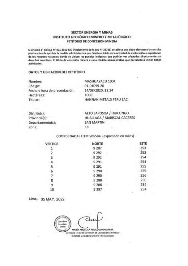 SECTOR DE ENERGIA Y MINAS INSTITUTO GEOLÓGICO MINERO Y METALÚRGICO: PETITORIO DE CONCESION MINERA
