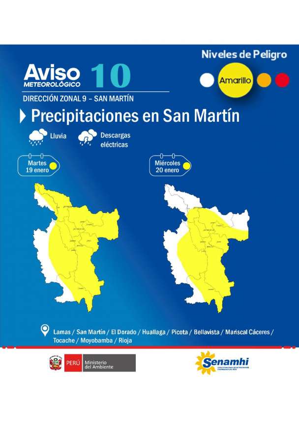 Dirección Zonal 9 – San Martín del SENAMHI informa que, desde el martes 19 hasta el miércoles 20 de enero, se registrará lluvia de moderada a fuerte intensidad en la región, acompañada de descargas eléctricas y ráfagas de viento superiores a los 50 km/h.
