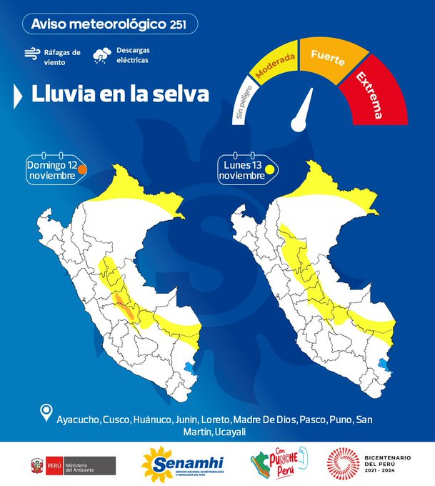 Según el aviso meteorológico N° 251, con nivel de alerta naranja, del Senamhi, se prevén acumulados de lluvia cercanos a los 45 milímetros por día en la selva norte, de alrededor de los 40 milímetros por día en la selva central y valores por encima de los 50 milímetros por día en la selva sur.