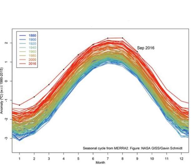 La temperatura de septiembre de 2016 superó por sólo 0,004 grados el récord de calor para esta época del año, que hasta ahora correspondía a septiembre de 2014. Con esta pequeña diferencia, el GISS considera que se ha producido un empate técnico entre los meses de 2014 y 2016, aunque destaca que el dato más significativo es que el mes pasado marcó un registro que supera en casi un grado (para ser exactos, 0,91 grados) la temperatura media de los meses de septiembre entre 1951 y 1980.