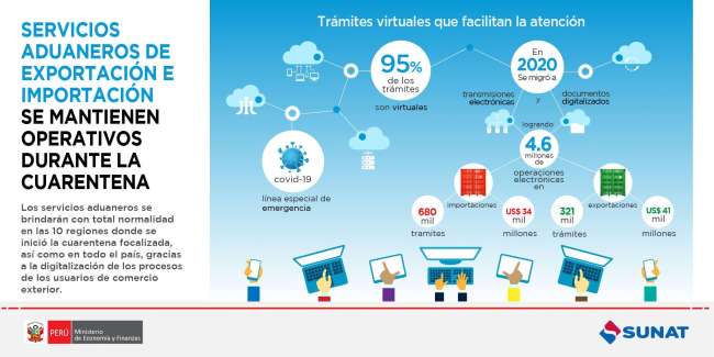 Los servicios aduaneros de importación y exportación continúan brindándose con total normalidad en las 10 regiones donde se inició la cuarentena focalizada para prevenir la propagación de la COVID-19, así como en todo el país, debido a la digitalización de los procedimientos que deben realizar los usuarios de comercio exterior.