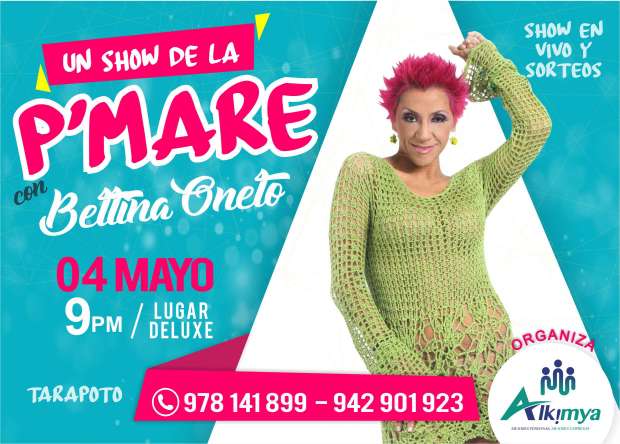 Porque Tarapoto pide show Este viernes 04 de mayo un gran evento lleno de música, ocurrencias, chistes y grandes recuerdos con una de las showoman más importantes del Perú, Bettina Oneto, comediante, cantante, humorista quien nos acompañará en un noche denominada Un Show de la P’MARE.
