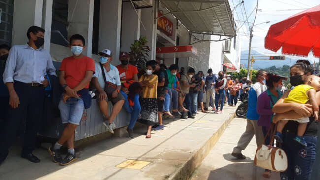 Largas colas se registran los últimos días desde muy temprano en el Banco de la Nación. En Tarapoto, dio la vuelta toda la manzana de la entidad bancaria ubicada en el centro de la ciudad, pobladores llegaron de diferentes localidades para cobrar el bono Yanapay y otros trámites.