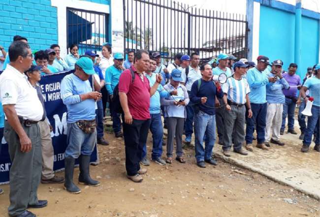 Por su parte la gerente general de EMAPA San Martín, María Isabel García Hidalgo, respondió que la medida de fuerza que vienen acatando los trabajadores sindicalizados, está en un proceso por la vía judicial, es por ello que les recomendó esperar los resultados para que vean la manera de pagarles, porque considera que es un derecho que les corresponde. (Hugo Anteparra)