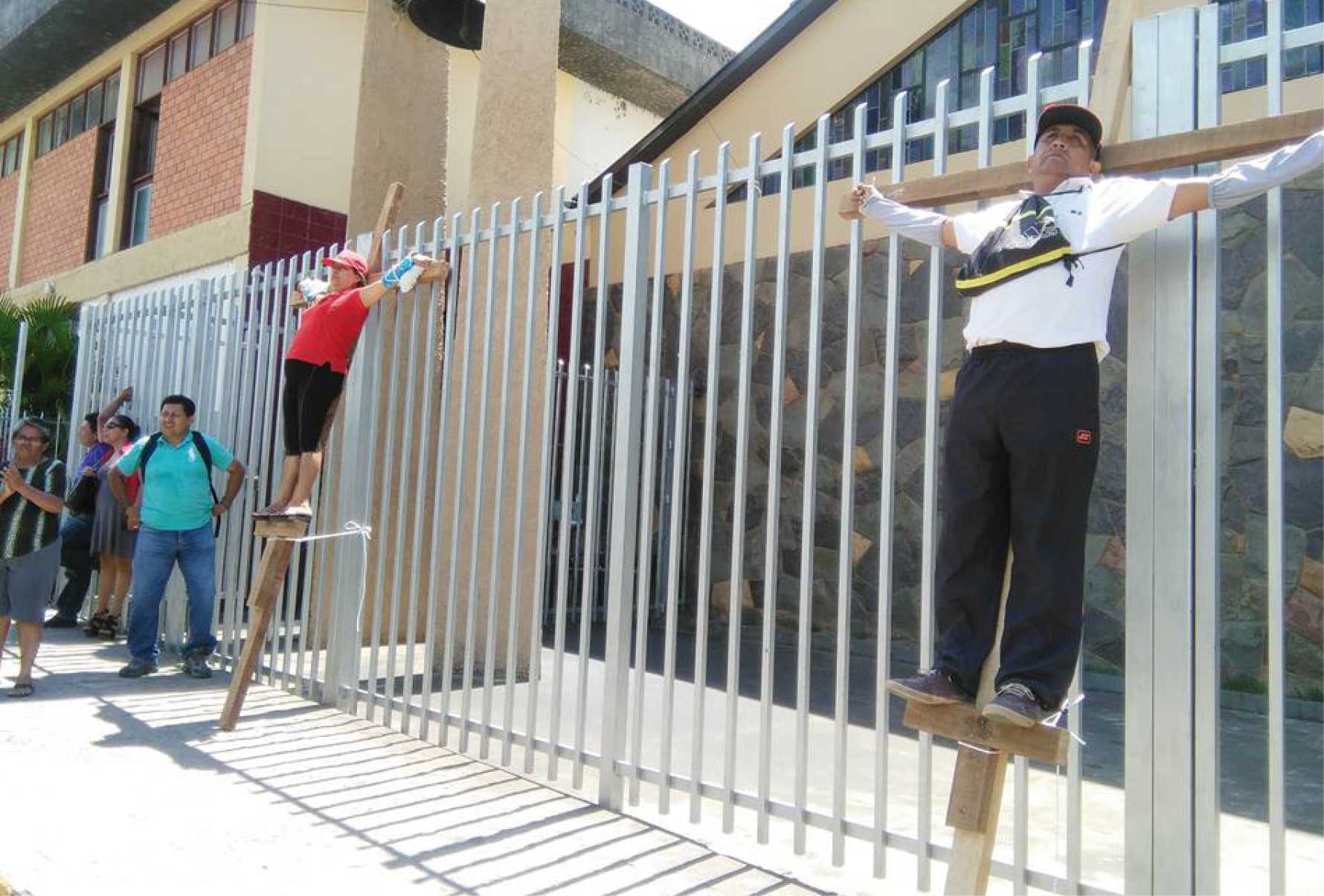 Para llamar la atención de las autoridades, los trabajadores administrativos del sector Educación radicalizaron ayer por la mañana su medida de fuerza, porque hasta el momento el gobierno central no atiende sus demandas. De manera simbólica dos personas radicalizaron su medida de fuerza y se crucificaron en el frontis de la iglesia de Tarapoto.