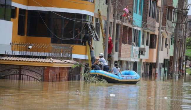 En el distrito de San Juan de Lurigancho, agentes de la Policía Nacional y del Cuerpo de Bomberos han rescatado a varias personas que se habían quedado atrapadas en sus viviendas este domingo luego del gigantesco aniego.