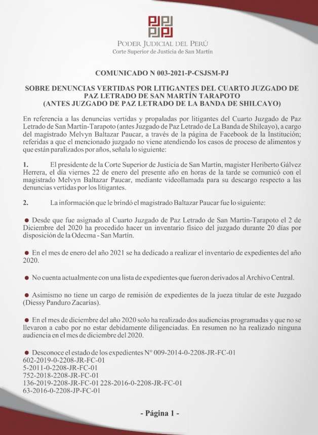 En referencia a las denuncias vertidas y propaladas por litigantes del Cuarto Juzgado de Paz Letrado de San Martín-Tarapoto (antes Juzgado de Paz Letrado de La Banda de Shilcayo), a cargo del magistrado Melvyn Baltazar Paucar, a través de la página de Facebook de la Institución; referidas a que el mencionado juzgado no viene atendiendo los casos de proceso de alimentos y que están paralizados por años, señala lo siguiente: