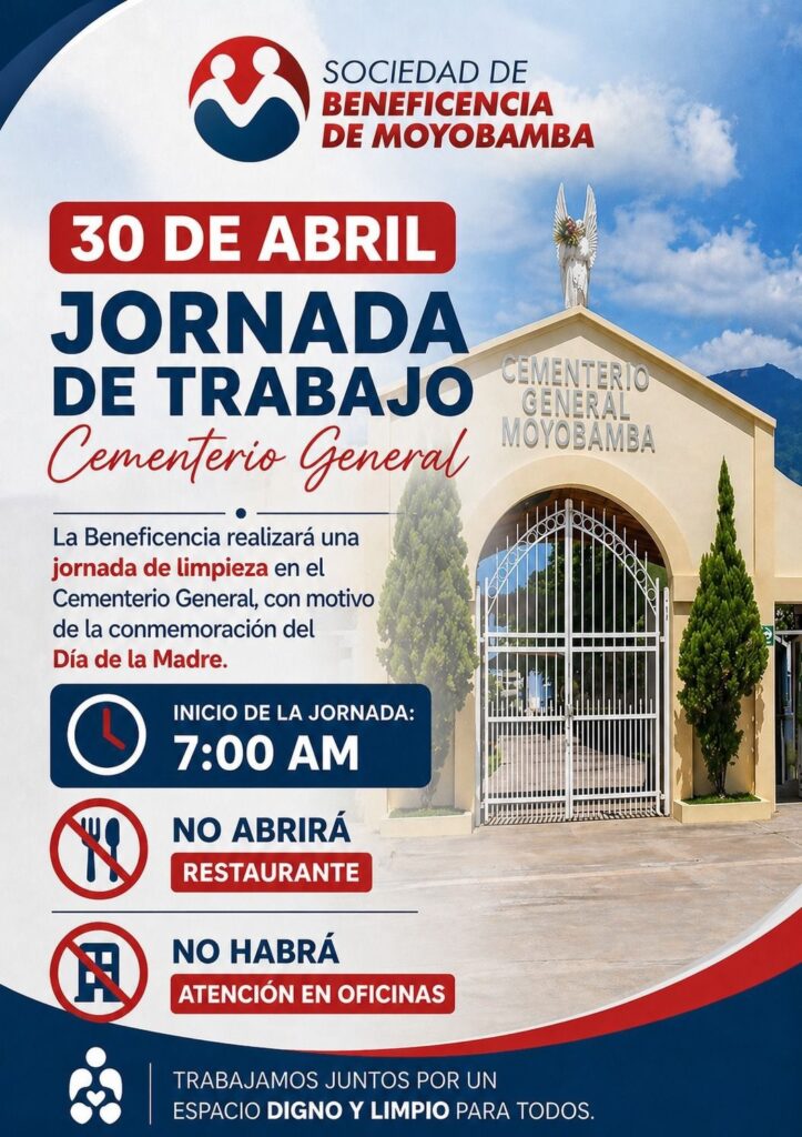La Sociedad de Beneficencia de Moyobamba, bajo la dirección del presidente del Directorio, Abog. Jesús Orlando Pinedo Barrutia, junto al gerente general, Ing. Luis Ángel García Rengifo; el gerente de Administración, Lic. Herbert Silva Noriega; el gerente Comercial, Ing. Kevin Limber Rodríguez Ruiz; y la gerente de Promoción Social, Lic. Krizia Melis Mendoza Bardales, en coordinación con todo el personal institucional, llevará a cabo hoy una importante campaña de limpieza en el Cementerio General de Moyobamba.