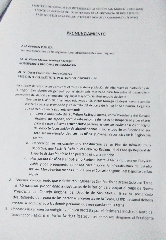 Moyobamba. Mediante documento de fecha 19 de enero del 2017 remitido al presidente del Instituto Peruano del Deporte (IPD) Lima, Oscar Fausto Fernández Cáceres y al gobernador regional de San Martín Víctor Noriega Reátegui, el Frente de Defensa de los Intereses de la Región San Martin (FREDESAM), presidido por Demetrio Villalobos Núñez solicita la destitución del director regional del IPD San Martin Prof. Wilson Reátegui Inuma.