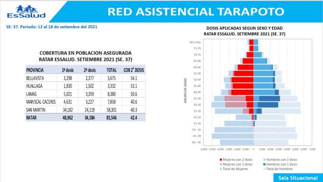A partir de un informe realizado por la Unidad de Inteligencia Sanitaria de la Red Asistencial Tarapoto EsSalud, desprende que, a la fecha, se ha aplicado 83 mil 546 dosis de vacunas contra la Covid-19, siendo 48,962 de primeras dosis y 34,584 de segundas dosis, quedando 14,378 asegurados que deben recibir su dosis completa para estar totalmente inmunizados, de acuerdo a los grupos etarios que se han determinado en la región San Martín.