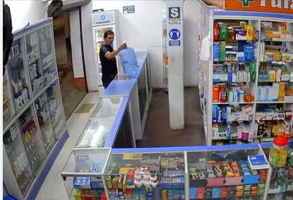 Un sujeto es captado por las cámaras de video vigilancia, robando un bidón de agua de una farmacia ubicada al frente de la plazuela Bolognesi en el barrio de Zaragoza, quien no se imaginó que todos sus movimientos eran grabados y que ahora servirán para que la policía de con su paradero.