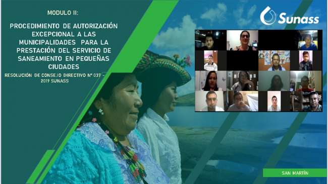 La Superintendencia Nacional de Servicios de Saneamiento (Sunass) llevó a cabo el curso virtual “Procedimiento para la autorización excepcional a las municipalidades para la prestación de los servicios de saneamiento en las pequeñas ciudades”, mediante el cual se capacitó a más de 65 personas, entre responsables de las áreas técnicas municipales (ATM) de los gobiernos locales de la región San Martín, y especialistas del Centro de Atención al Ciudadano (CAC), del Programa Nacional de Saneamiento Urbano y Rural, y de la Dirección Regional de Vivienda, Construcción y Saneamiento.