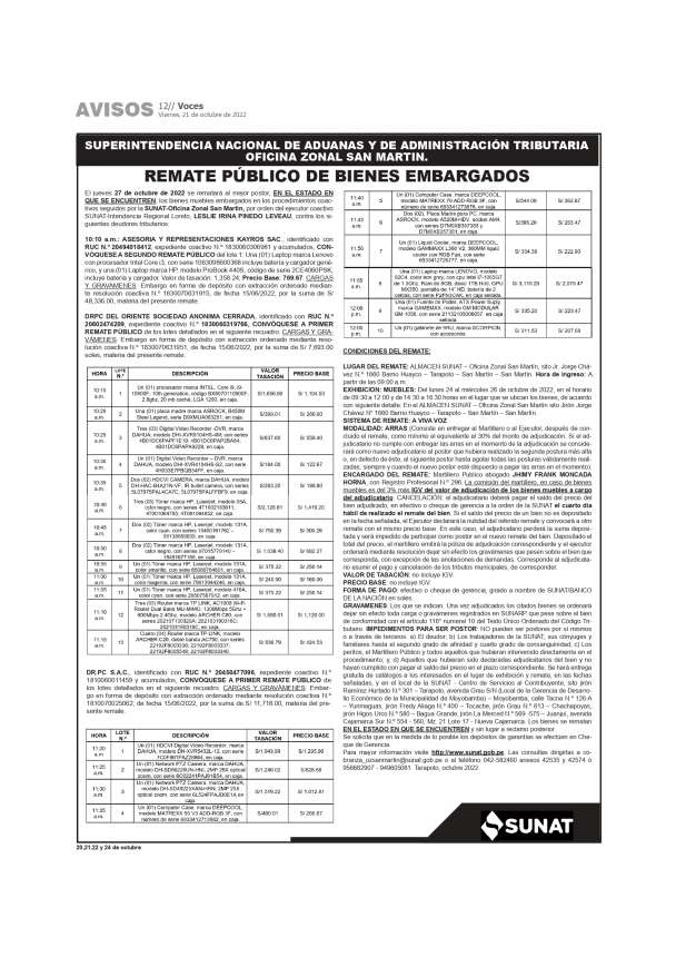 SUNAT: Remate Público de Bienes Embargados