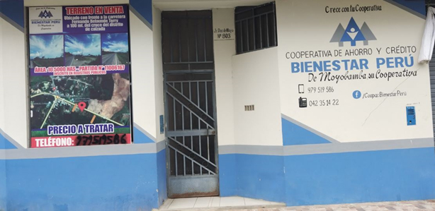 La Superintendencia de Banca y Seguros (SBS), intervino en horas de la mañana del 14 de diciembre a la Cooperativa Bienestar Perú Limitada, ubicada en la cuadra 8 del jirón Dos de Mayo en el barrio de Lluyllucucha de la ciudad de Moyobamba.