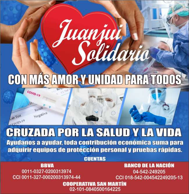 En apoyo al Comanto COVID de Operaciones de Emergencia Provincial, un colectivo de ciudadanos entusiastas y de buena voluntad de la provincia de Mariscal Cáceres viene impulsando la cruzada humanitaria denominada «Juanjuí Solidario» que con el lema «con más amor y unidad para todos» busca recaudar la contribución económica y donativos de la ciudadanía para la compra de Equipos de Protección Personal (EPP) de salud y pruebas rápidas para la detección de pacientes COVID 19.