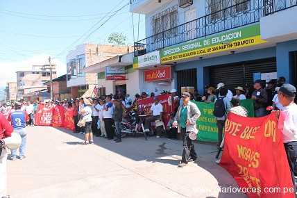En el primer día del paro de 48 horas que el Sindicato Único de Trabajadores de la Educación del Perú, SUTEP, base de la provincia de San Martín, los profesores de Tarapoto, Morales y La Banda de Shilcayo realizaron una marcha de protesta por diversas arterias de la ciudad, culminando su movilización frente al local de la UGEL San Martín.