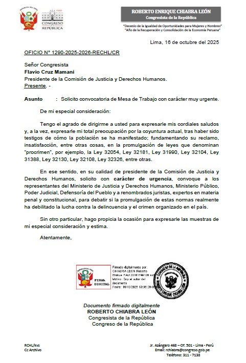 Mediante el oficio N.º 1290-2025-2026, dirigido al presidente de la Comisión de Justicia y Derechos Humanos, Flavio Cruz Mamani, el legislador pidió convocar una mesa de trabajo con la participación del Ministerio de Justicia y Derechos Humanos (Minjusdh), el Ministerio Público (MP), el Poder Judicial (PJ), la Defensoría del Pueblo y juristas especializados en materia penal y constitucional. El objetivo, precisó, es evaluar si la promulgación de estas normas ha debilitado la lucha contra el crimen organizado y la seguridad ciudadana.