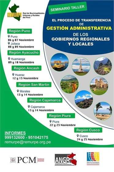 Directivos de la Red de Municipalidades Urbanas y Rurales del Perú – REMURPE anunciaron que a través de la Plataforma Intergubernamental constituida por la REMURPE, Asamblea Nacional de Gobiernos Regionales – ANGR, la Presidencia de Consejo de Ministro – PCM y la Mesa de Concertación para la Lucha Contra la Pobreza – MCLCP, que vienen organizando seminarios talleres sobre “Proceso de Transferencia de la Gestión Administrativa de los Gobiernos Regionales y Locales”, en siete regiones del país con la finalidad de contribuir en una adecuada transferencia de manera responsable, ordenada y transparente de acuerdo a la normativa vigente.