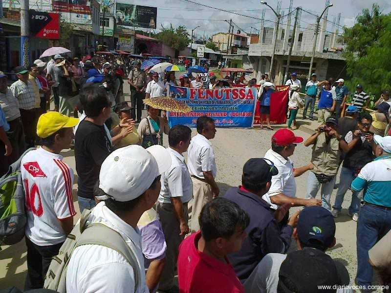 Trabajadores públicos toman puente sobre el río Shilcayo en Tarapoto, en protesta por lay Servil que pretende implantar el gobierno, la Policía Nacional se prepara para desalojarlos. A las 11 am de hoy, lograron recorrer las calles de Tarapoto con banderolas y carteles en mano en donde evidencian las instituciones a las que representan y su medida de lucha.