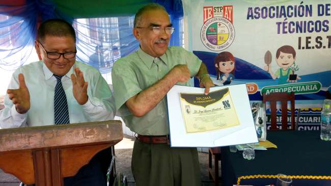 Yurimaguas. En ceremonia especial realizada el martes 30 de abril en el patio de honor de la Institución, el director general (e) del Instituto de Educación Superior Tecnológico Público Amazonas Yurimaguas (IESTPAY), Mg. Eleodoro Calixto Vásquez, reconoció y agradeció al presidente de la comisión organizadora de la Universidad Nacional Autónoma de Alto Amazonas (UNAAA), Dr. Jorge Lescano Sandoval, por su destacada gestión en hacer realidad el convenio específico para desarrollar el Programa de Convalidación Académica de Contabilidad y Agronomía a favor de los profesionales técnicos egresados del IESTPAY de las carreras de Contabilidad y Producción Agropecuaria.
