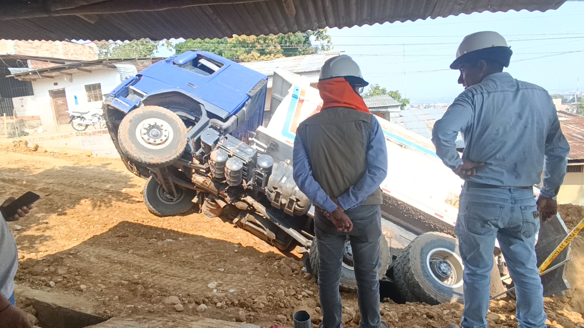 Un camión volquete terminó en una zanja en construcción para el cambio de redes de agua y desagüe en la cuadra seis del jirón Juan de la Riva Vásquez, en el barrio La Hoyada de Tarapoto, causando un gran susto entre los vecinos de la zona. Afortunadamente, el conductor salió ileso del incidente.