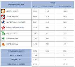 No obstante, el resultado que aun se encuentra en compás de espera es el de los consejeros regionales. De momento, en la primera ubicaión se encuentra Elia Córdova Calle de Alianza Para el Progreso con 19.28% (que significan 18481 votos. En segundo lugar, pisando los talones se encuentra Crover Sánchez de Acción Popular con 19.01%, lo que significa 18254 votos a su favor.