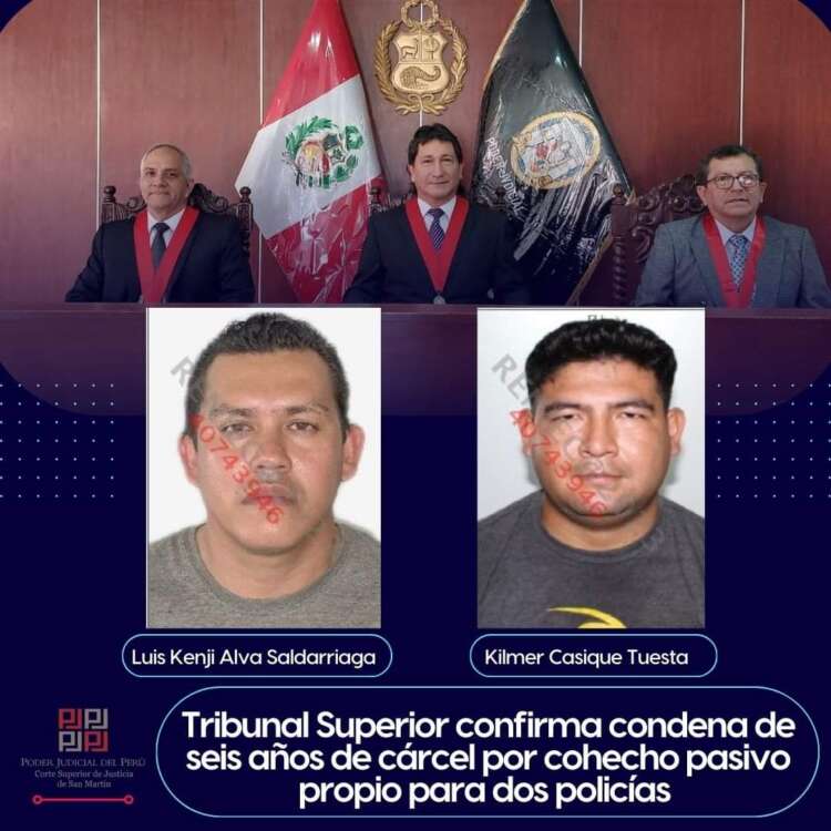 La Sala Penal de Apelaciones de Moyobamba decidió ratificar la condena de seis años de cárcel efectiva impuesta en primera instancia contra los efectivos policiales Kilmer Casique Tuesta y Luis Kenji Alva Saldarriaga por el delito contra la administración pública en la modalidad cohecho pasivo propio.