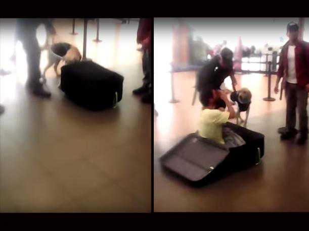 Como parte del control de equipaje, un perro detectó algo inusual al interior de la maleta. Grande fue la sorpresa de los efectivos cuando al abrirla, encontraron dentro a un joven acurrucado, pretendiendo, según sugiere el video, salir así del país.