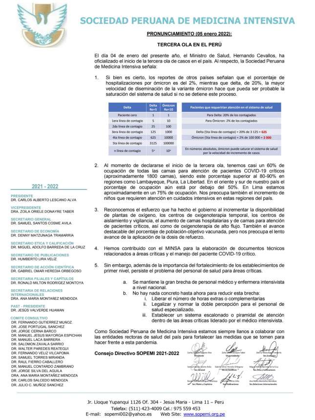 A la población en general, la SOPEMI recordó la necesidad de contar, como mínimo, con dos dosis de vacunas contra la COVID y resaltó la importancia de la dosis de refuerzo. Además, pidió que se cumplan las medidas de manera estricta.