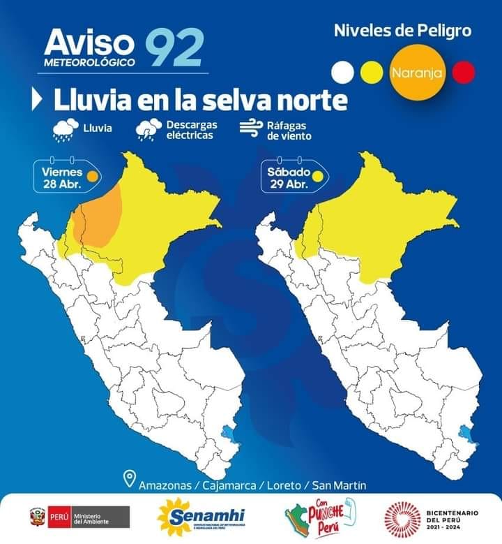 SENAMHI PERU Informa que entre el viernes 28 y sábado 29 de abril 2023, se presentará lluvia moderada a fuerte intensidad en la selva norte, acompañada de descargas eléctricas y ráfagas de viento superiores a 35 km/h. Tomar sus previsiones.